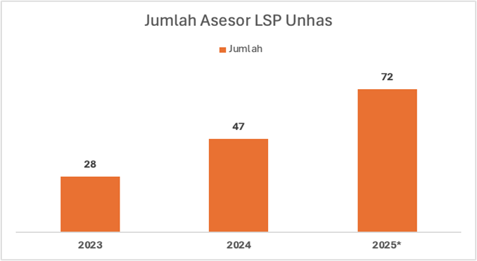 - Sehingga Total Asesor LSP unhas pada tahun 2025* ditargetkan mencapai 147 Asesor dan angka ini akan terus bertambah seiring penambahan ruang lingkup di LSP Unhas.