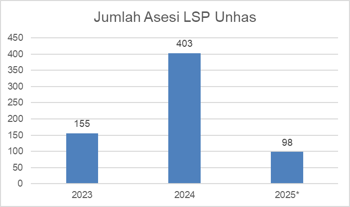 - Sehingga Total asesi LSP unhas hingga tahun 2025* berjumlah 656 (3 Tahun). Angka ini akan bertambah seiring dengan akan diberlakukannya Uji Kompetensi secara rutin dan berkesinambungan setiap bulannya.